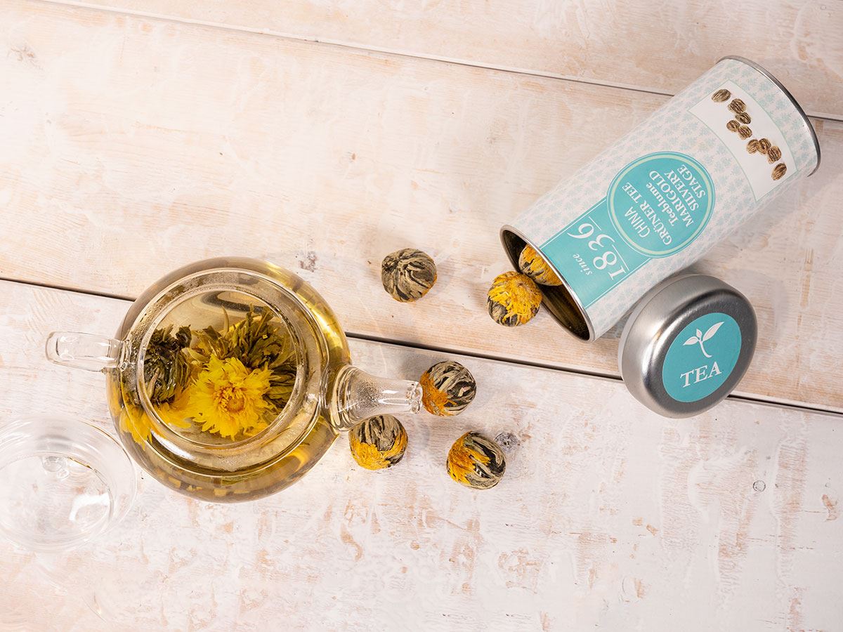 The basis for this exquisite arrangement of tea and blossoms is laid each year in the province of Guangxi where only select tea plants are carefully cultivated. A limited amount of fine, young sprouts and buds needed for this handmade quality are picked in spring. The heart of this blooming tea is formed by marigold blossoms, which unfold like the sun and are surrounded by a wreath of green, glowing leaf tips. Smooth and flowery on the palate with a honey-coloured infusion.