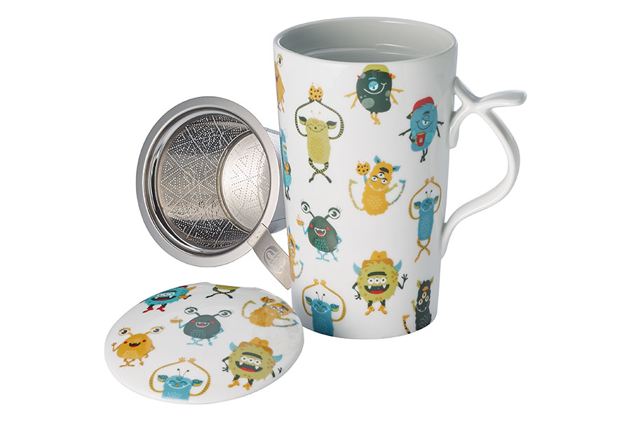 Jumbo Herb Tea Mug “Happy Monsters” with strainer. Porcelain 0.4 l, H 15.5 cm, Ø 8 cm.