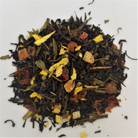 This extraordinary blend of black tea with a portion of green tea enjoys great popularity. This tea is not only strikingly decorated, the selected ingredients unite to create a completely new taste experience: the sweet papaya interacts harmoniously with the fine tartness of the intensely red, rose hip peel. Lightly flavoured with the full, fruity flavours of select, high quality, exotic but also popular domestic fruits – a unique taste sensation. Simply magical!